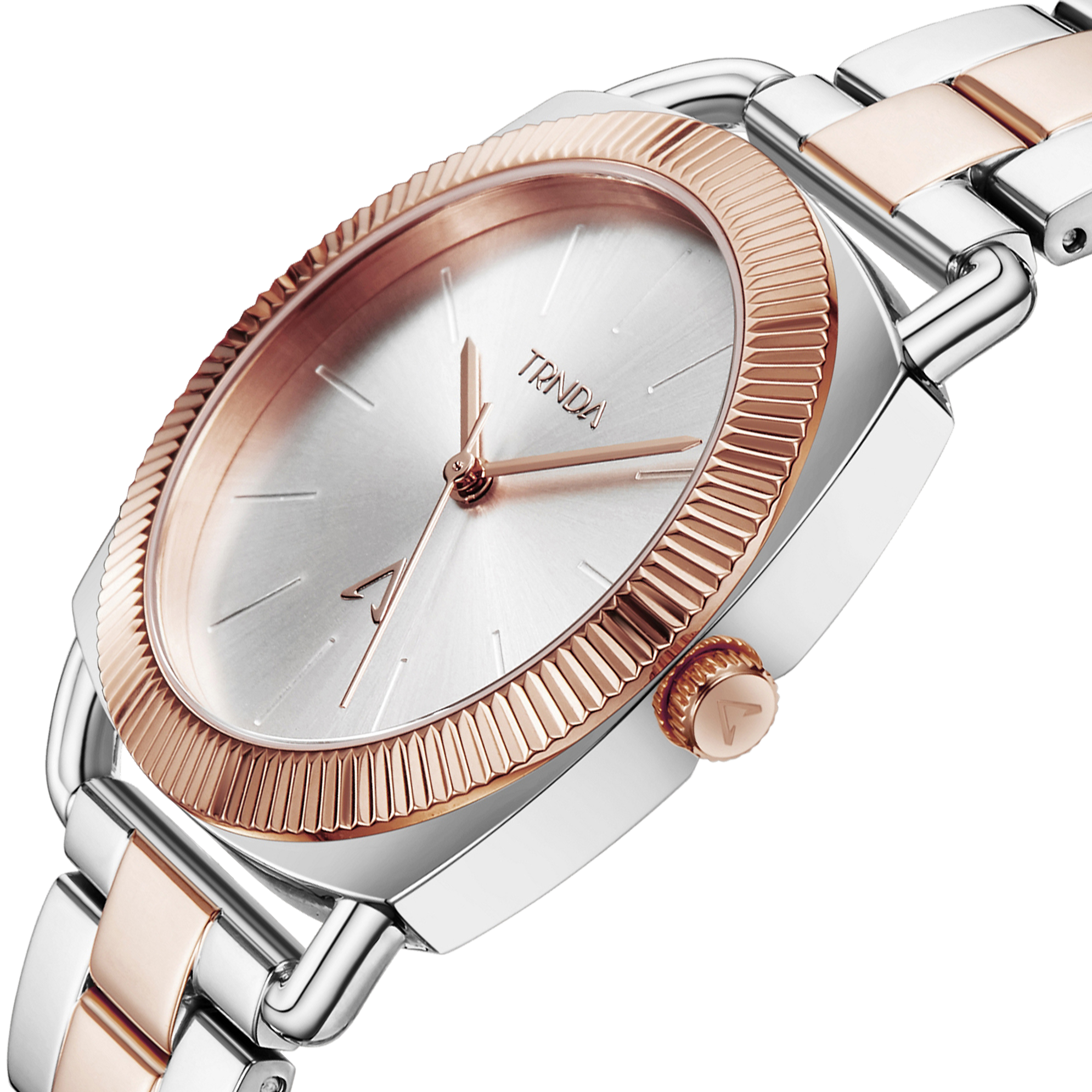 Diese Uhr hat auch ein zweifarbiges Silber-Roségold- Armband aus massivem Edelstahl