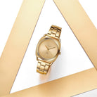 You'll love this watch with a Gold Solid Stainless-Steel band that's stylish and durable. It's the perfect accessory for any occasion, whether you're dressing up or down. It's also built to last, so you can trust it to keep time and look great for years to come.